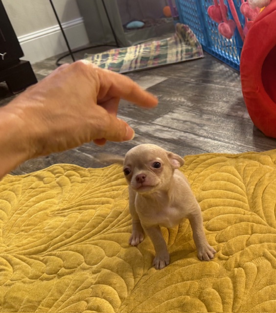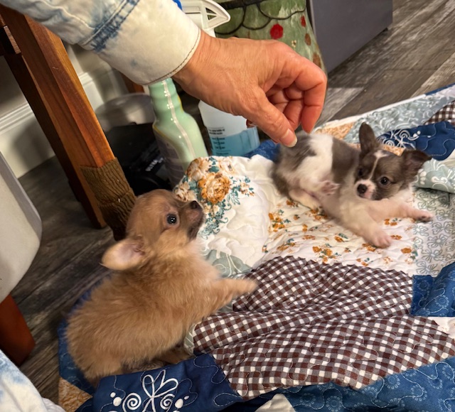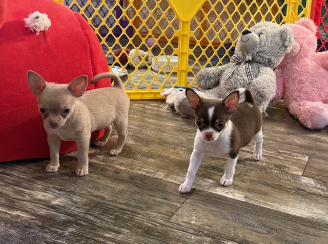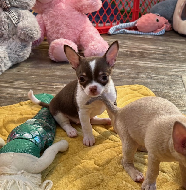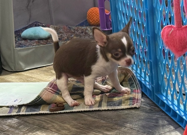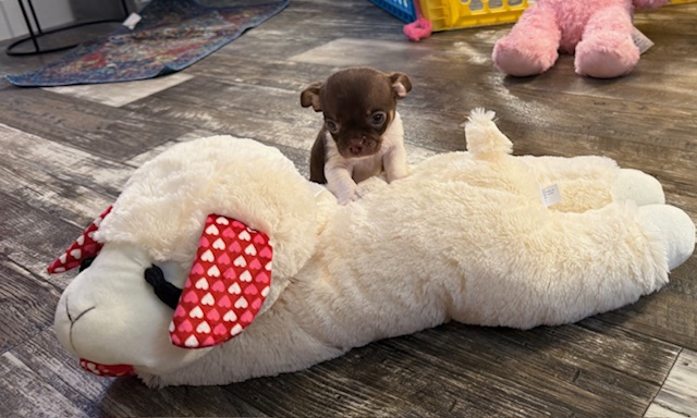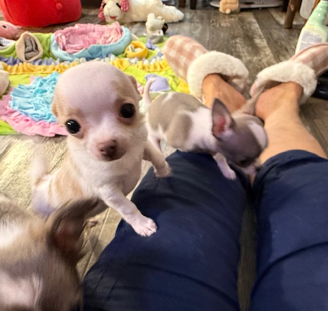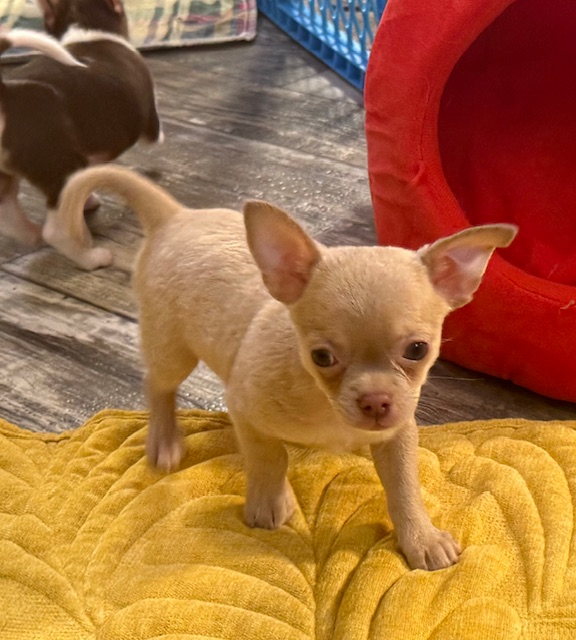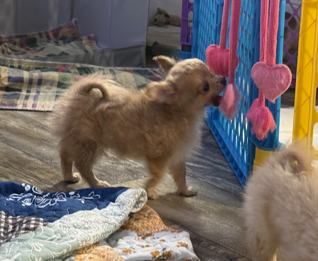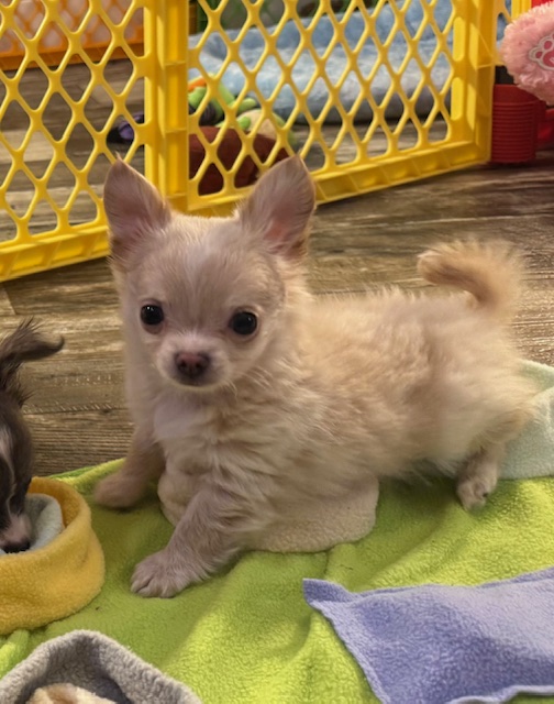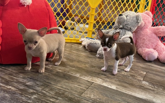 Welcome to our available puppy page. You came to the right place if you are looking for a healthy, beautiful and very social chihuahua puppy. At Ueys, we realized long ago that chihuahuas can ALL be very friendly and love every stranger they meet if raised properly. We also aggressivly work on potty training. The breeder has to be dedicated and willing to stay home most of the time. Breeders that work 40 hours a week at an outside job and hang out at dog shows all weekend are not doing justice to their puppies at home or their adults that need CONSTANT attention. With almost 3.5 decades of meticulously breeding out unhealthy traits and consistenly upgrading standards, we do not need to spend all of our precious spare time attending dog shows to prove anything. When you visit here, you will meet VERY social puppies. We are proud of our breeding program; that we have been improving upon since 1992. Scroll down to see our available puppies raised with a passion. Our puppies are given the best start possible and our dedication shows. Our dogs have excellent health insurance with Fetch and are genetically tested. Feel free to ask to see proof and I will proudly reply. When you purchase a puppy from Uey's, you will also have access to a very dedicated breeder that answers her phone for her saved contacts right away and provides her home phone for after hours if needed.
