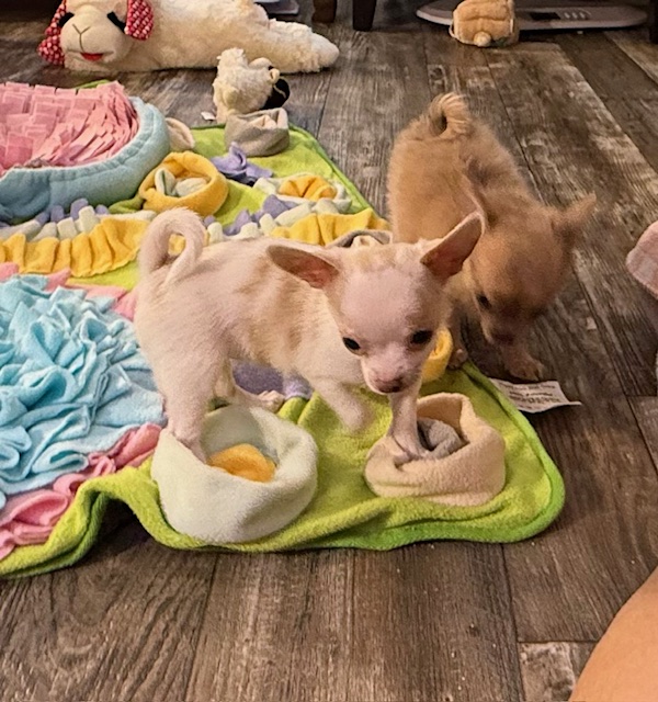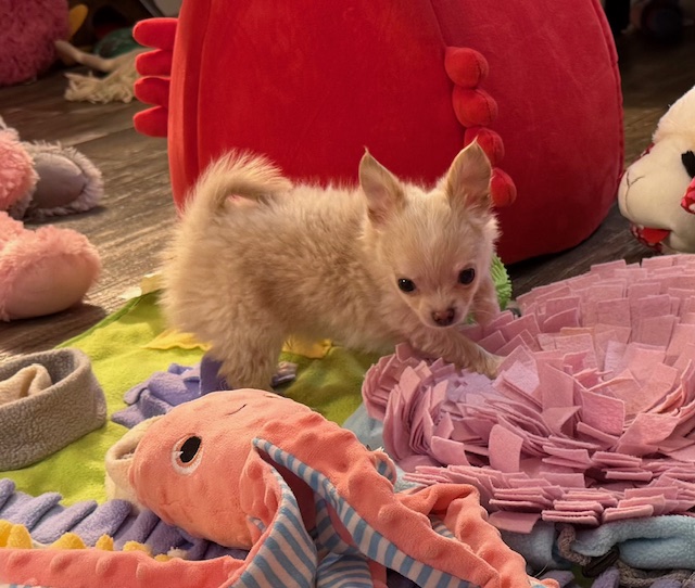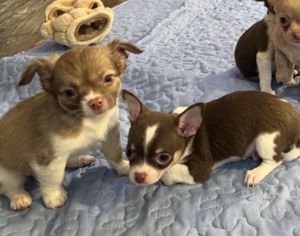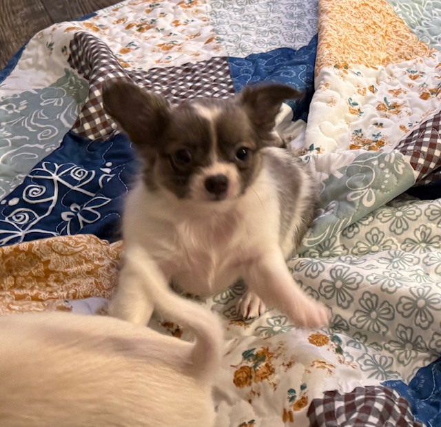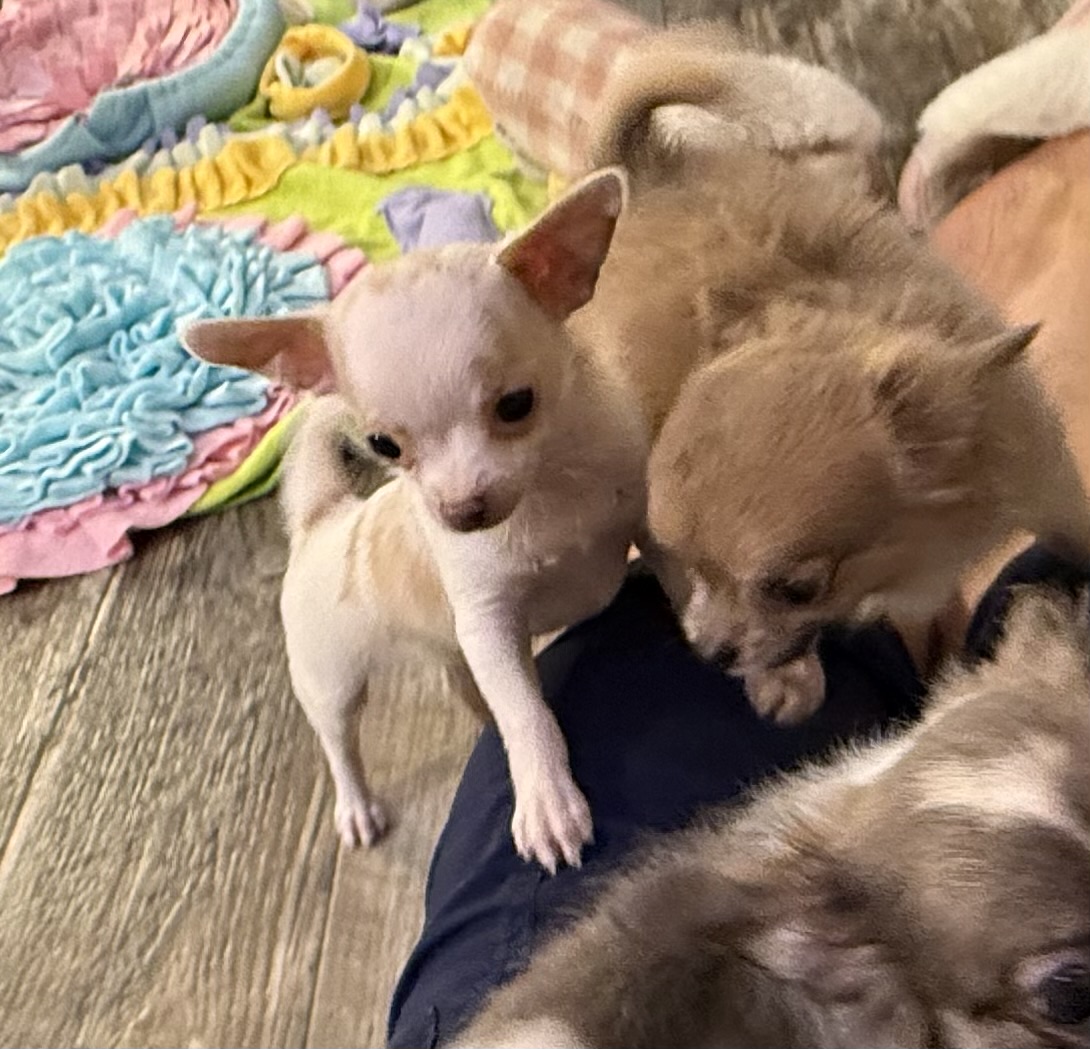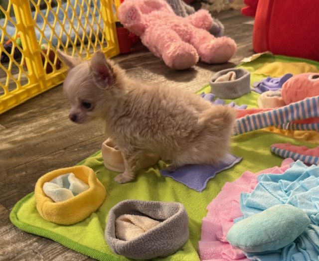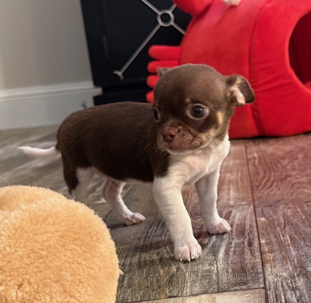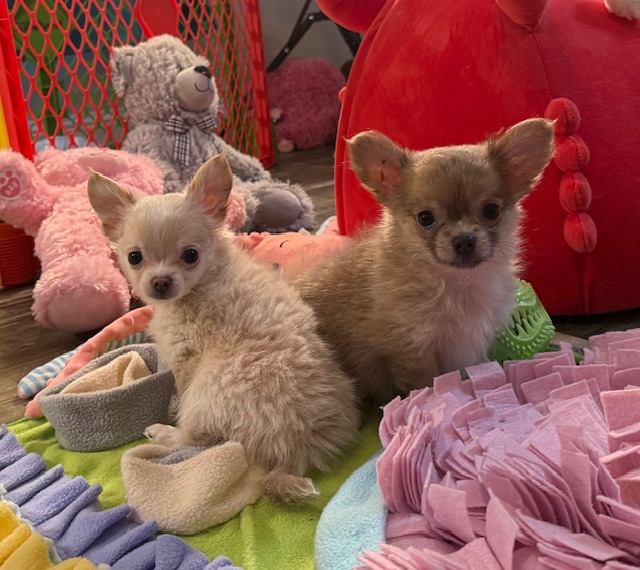 Welcome to our available puppy page. You came to the right place if you are looking for a healthy, beautiful and very social chihuahua puppy. At Ueys, we realized long ago that chihuahuas can ALL be very friendly and love every stranger they meet if raised properly. We also aggressivly work on potty training. The breeder has to be dedicated and willing to stay home most of the time. Breeders that work 40 hours a week at an outside job and hang out at dog shows all weekend are not doing justice to their puppies at home or their adults that need CONSTANT attention. With almost 3.5 decades of meticulously breeding out unhealthy traits and consistenly upgrading standards, we do not need to spend all of our precious spare time attending dog shows to prove anything. When you visit here, you will meet VERY social puppies. We are proud of our breeding program; that we have been improving upon since 1992. Scroll down to see our available puppies raised with a passion. Our puppies are given the best start possible and our dedication shows. Our dogs have excellent health insurance with Fetch and are genetically tested. Feel free to ask to see proof and I will proudly reply. When you purchase a puppy from Uey's, you will also have access to a very dedicated breeder that answers her phone for her saved contacts right away and provides her home phone for after hours if needed.